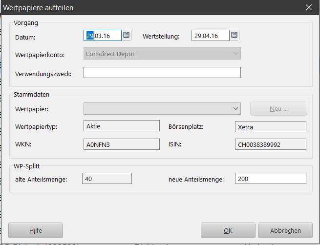 im Finanzmanager ist der WP-Splitt: für „40 Alte“ gab es „200 Neue“ so gespeichert (siehe Anlage) und insofern ist m. E. die Darstellung in der QIF auch richtig. Aber auch wenn ich den Satz in der QIF vollständig lösche kommt der Fehler "Anzahl der Anteile: Unbekanntes oder inkonsistentes Format" weiterhin.