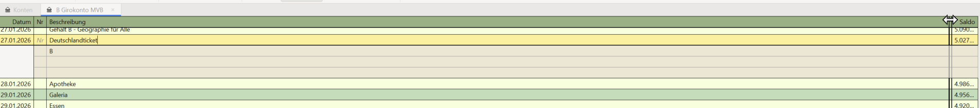 Ich habe ein sehr breites Feld für "Beschreibung" und die Spalten für die Kontenbezeichnungen, "Empfangen" "Ausgabe" und "Saldo" wurden so schmal, dass ich die Inhalte teilweise gar nicht mehr lesen kann. Jeder Versuch, die Spaltenbreite zu vergrößern, hat nur dazu geführt, dass die anderen Spalten noch schmaler wurden, so dass ich sie jetzt in einem Konto gar nicht mehr sehen kann.