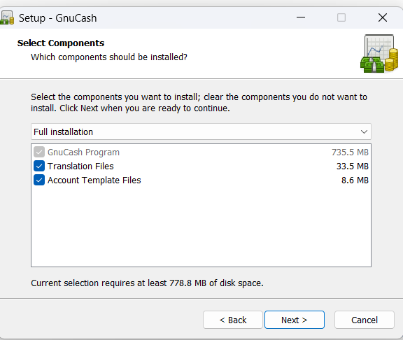 Seleccione la opción de instalación completa para asegurarse de que todos los componentes necesarios estén incluidos. Es importante tener en cuenta que GNUCash siempre aparecerá desvanecido durante el proceso de instalación. Continúe con la instalación para finalizar correctamente.