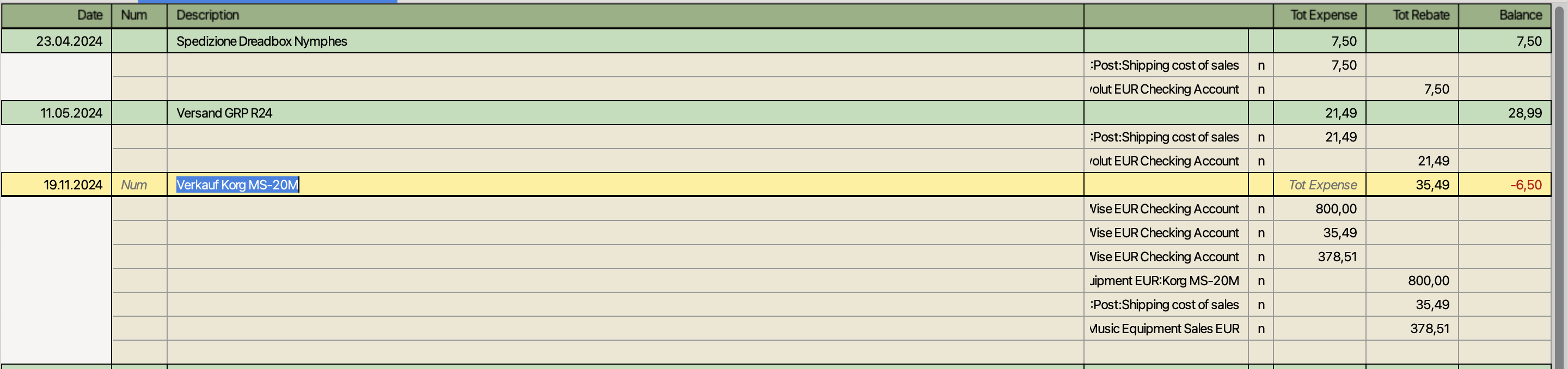 >> > seller - Transfer = "Expenses EUR:Post:Shipping cost of sales"