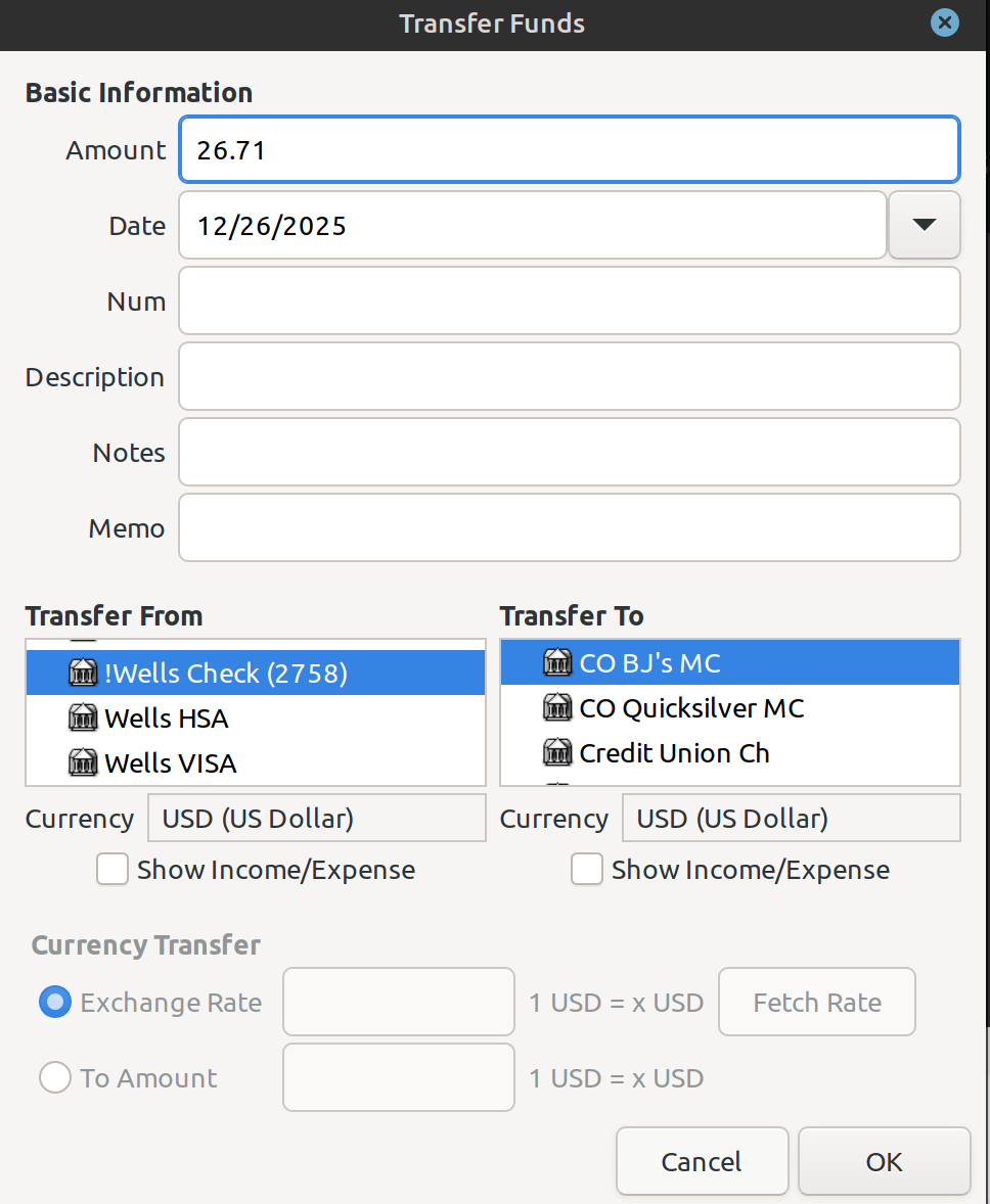 If the final MC means MasterCard, you are reconciling a credit card with a balance of 26.71 and Gnucsh wants to settle the balance on the card from your checking account.