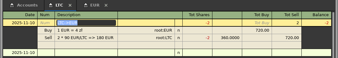 Sell: LTC -2 shares @ 360 zł = 720 zł total sell