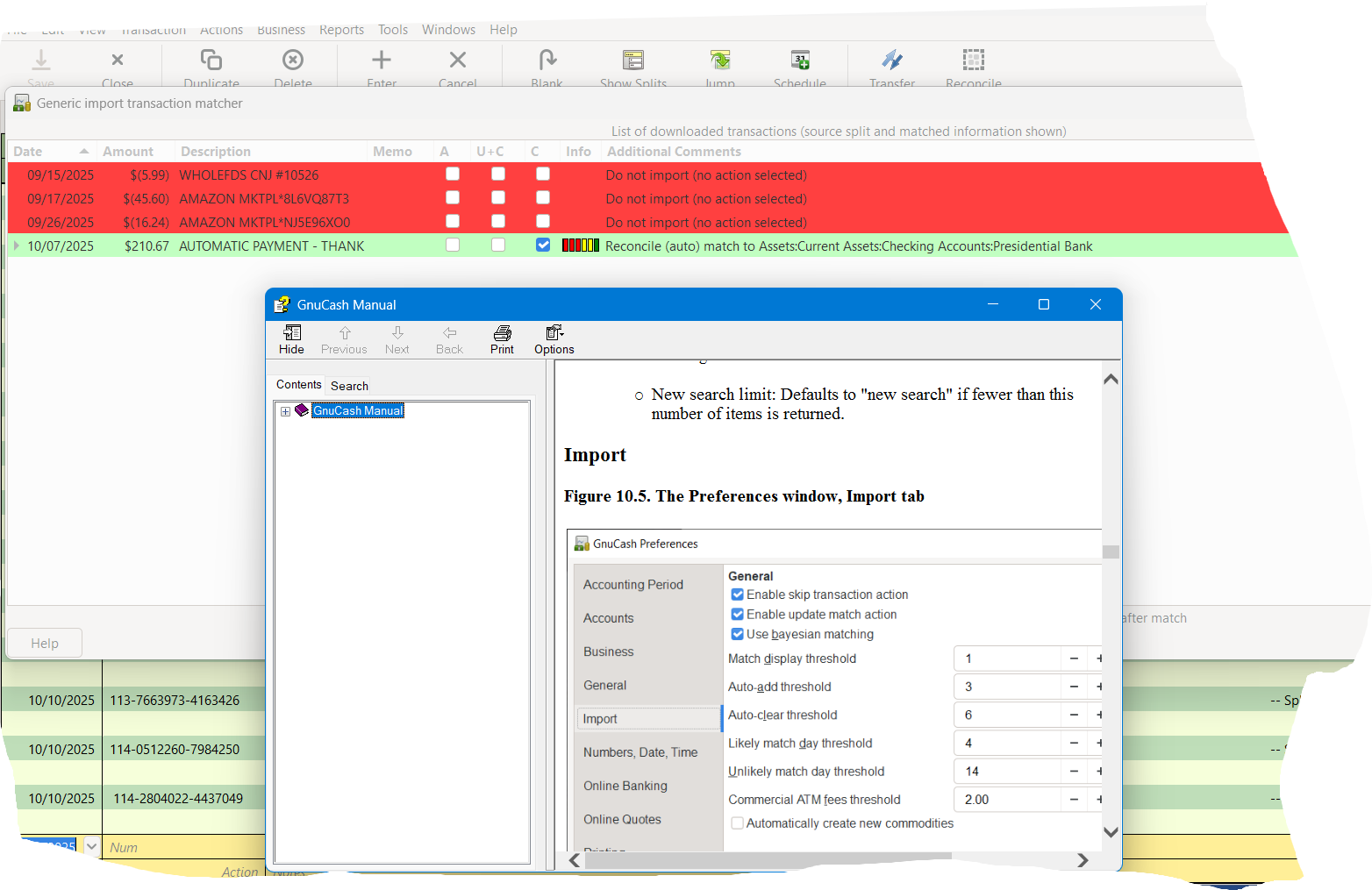 I asked about this a while back and I'm still having problems. I changed the import preferences back to the default as shown in the help. When I import the QFX file it does not match any of the entries (see the attached screen shot). When I click the "Clear" checkbox, it finds the matches. The entered date/(credit card receipt) dates of the transactions are as follows: 9/14 (9/15), 9/13 (9/17), and 9/27 (9/26). What setting would cause the import not to find these immediately as it did in the past.