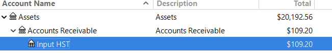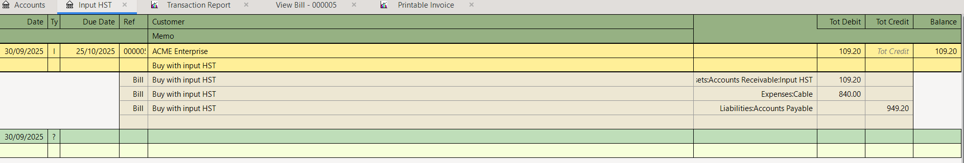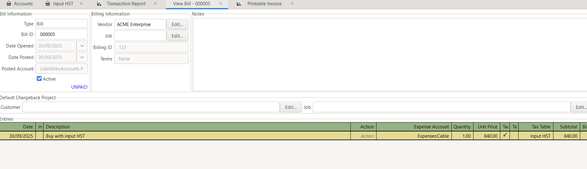 Set up a tax table named "Input HST" with a 13% rate, and linked it to the above account.