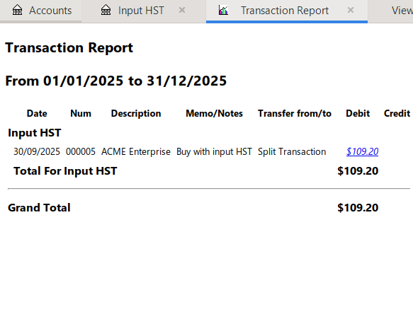Have attached some screen shots for you. In this example I have assumed you will have two accounts Input and Output HST, you may have a single account as well and the report will detail if it is a credit or debit.