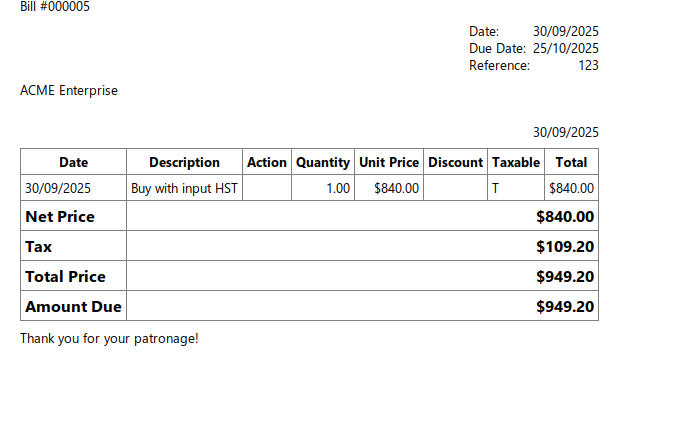 Created a bill for $860, marked as taxable, and applied the "Input HST" tax table.