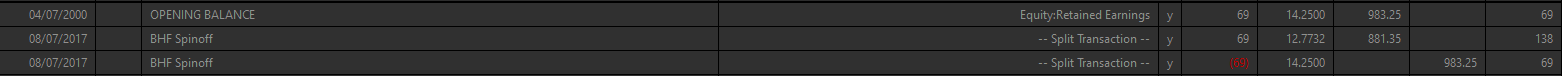 Spin off BHF 6.2727 shares Assets:Broker:BHF 6 17.87 107.22
